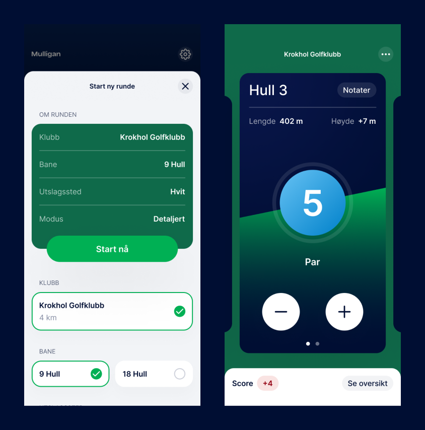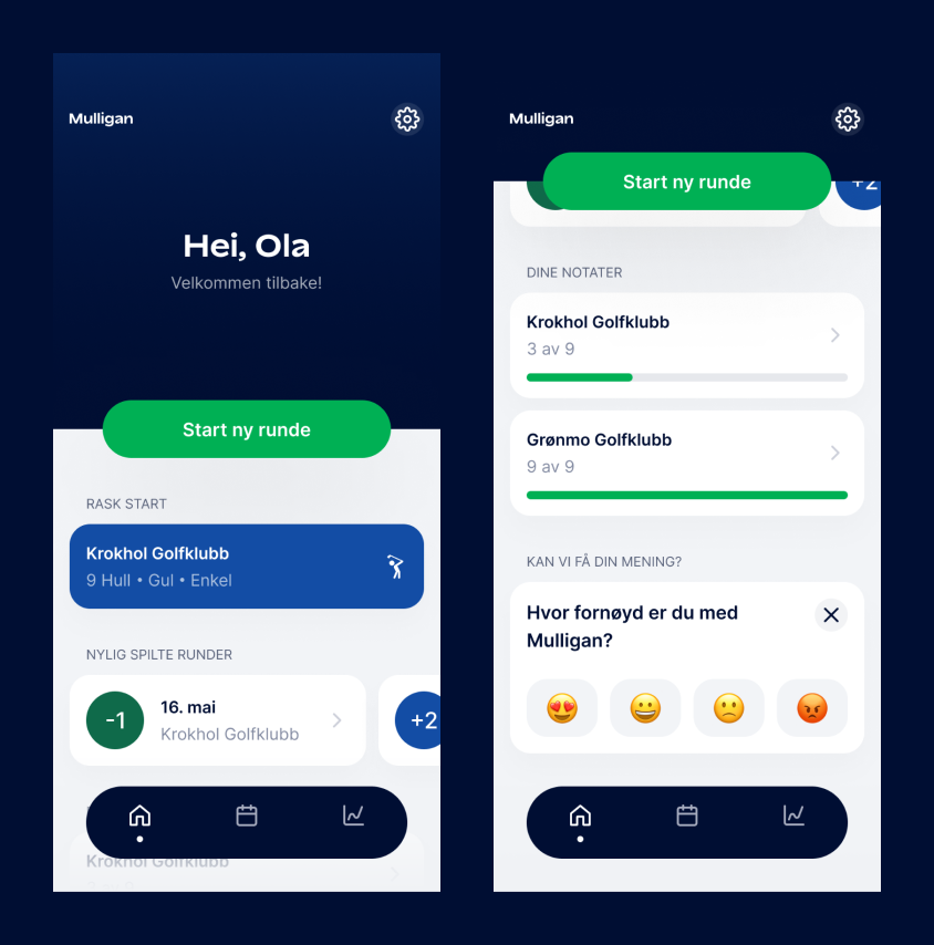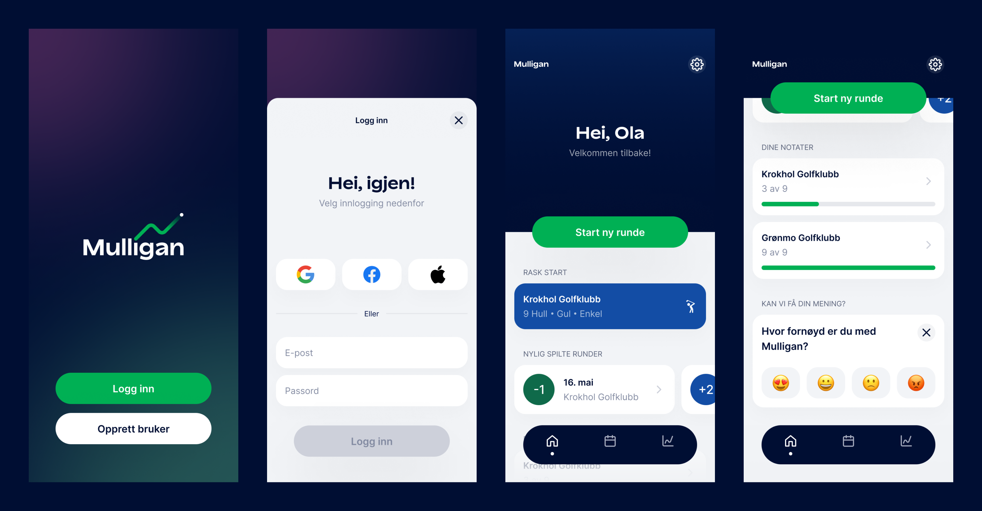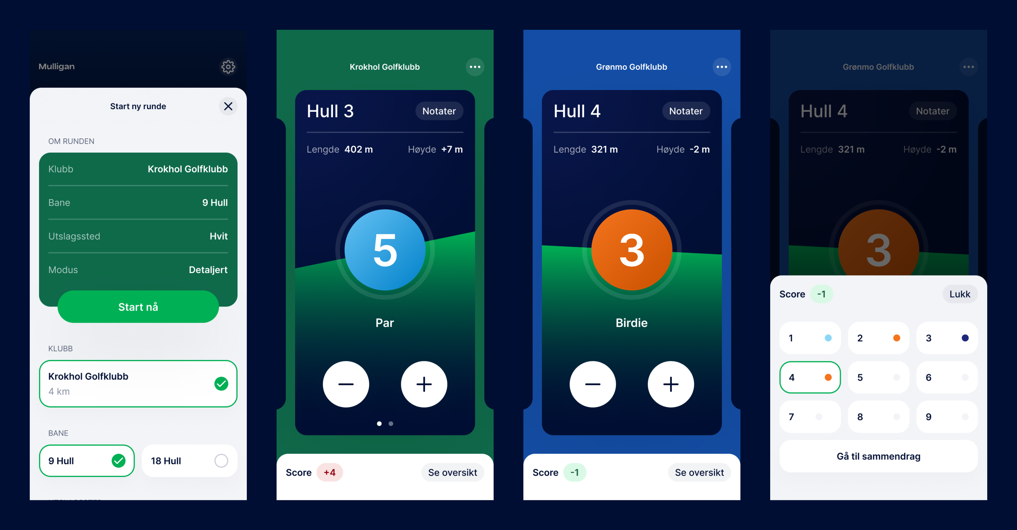 Mulligan is a golf app designed to provide better insight into one's own game, enabling players to develop and improve. I have taken the primary responsibility for the app's usability and aesthetics. A significant effort has been made to make the registration process on the course as simple as possible, ensuring that the app's usage does not affect the game in any way. The visual identity is clean and consists of graphical elements, along with a color palette easily associated with golf.