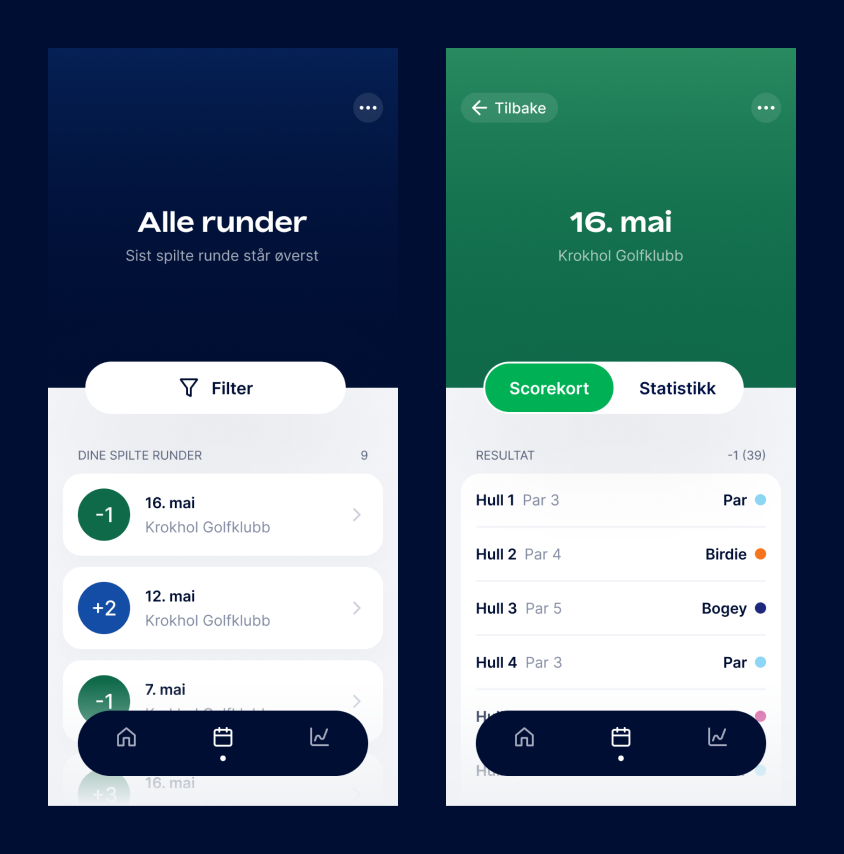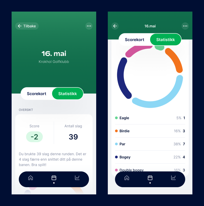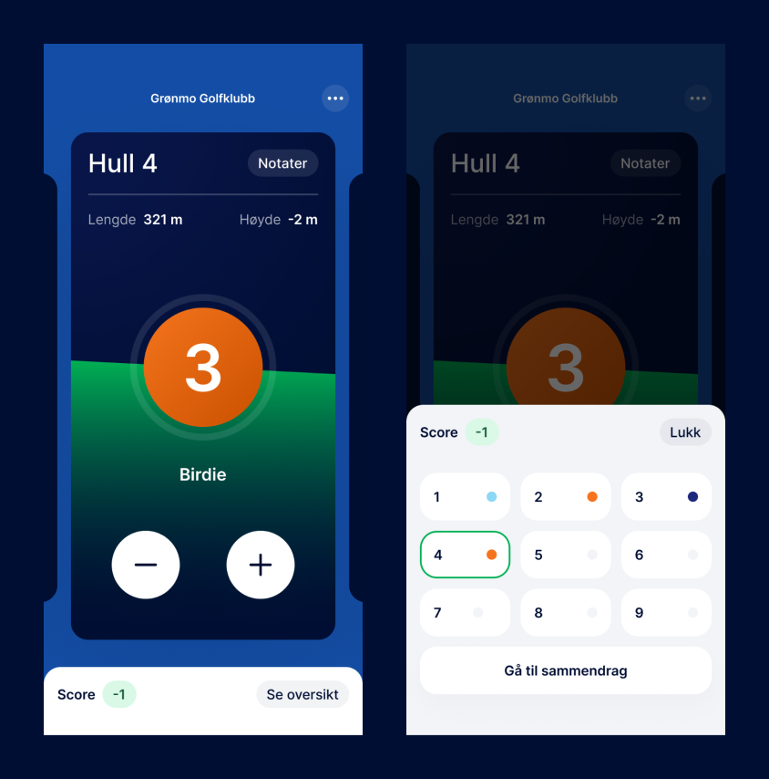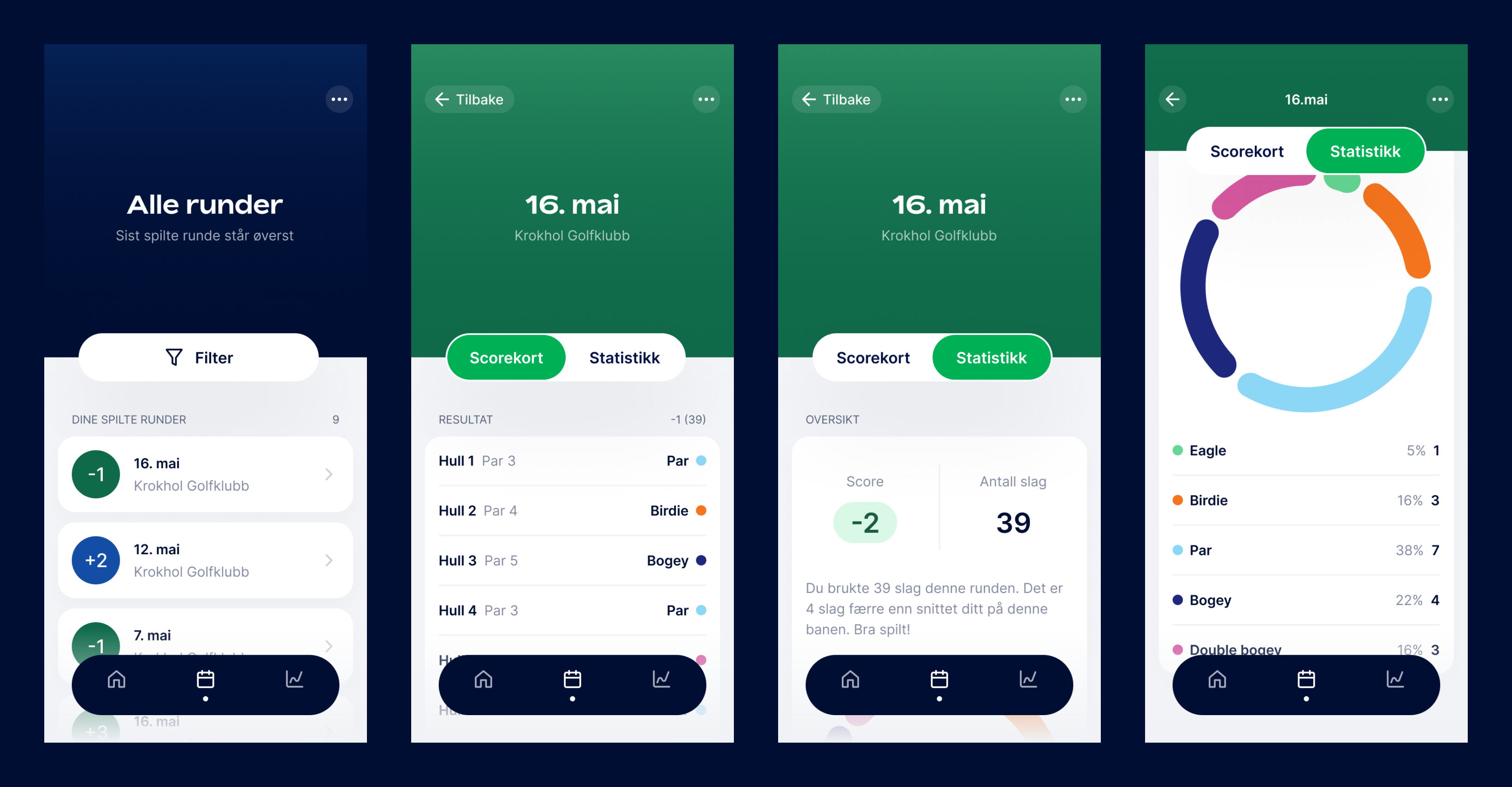 Mulligan is a golf app designed to provide better insight into one's own game, enabling players to develop and improve. I have taken the primary responsibility for the app's usability and aesthetics. A significant effort has been made to make the registration process on the course as simple as possible, ensuring that the app's usage does not affect the game in any way. The visual identity is clean and consists of graphical elements, along with a color palette easily associated with golf.